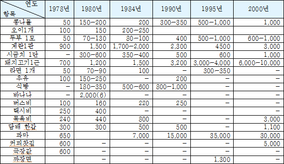 콩나물 50원, 담배 한갑이 300원, 계란한판이 1,200원, 우유 100원, 목욕비가 240원, 버스 100원, 라면 200원, 다방 차값은 600원이었답니다.
