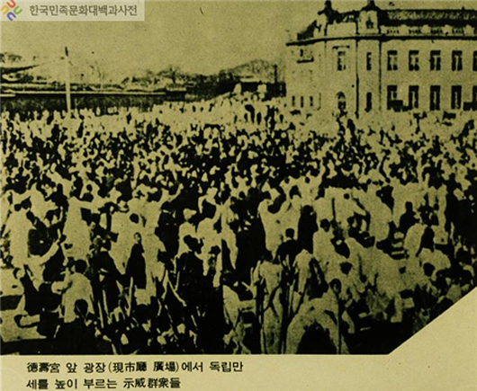 [그림 2] 서울 덕수궁 앞에서의 독립만세 시위. 출처 : 한국민족문화대백과