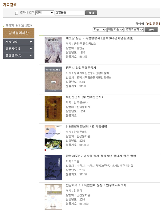 이외에도 경기도내 시.군 지역에서 진행되었던 삼일만세운동에 대한 내용도 ‘삼일운동’이나 ‘독립운동’으로 검색하면 아래와 같이 24건의 자료가 검색되어 지역에서의 삼일운동에 대한 내용을 찾아볼 수 있습니다.